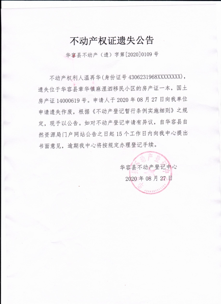 不动产权证遗失公告【房产证(温再华)】