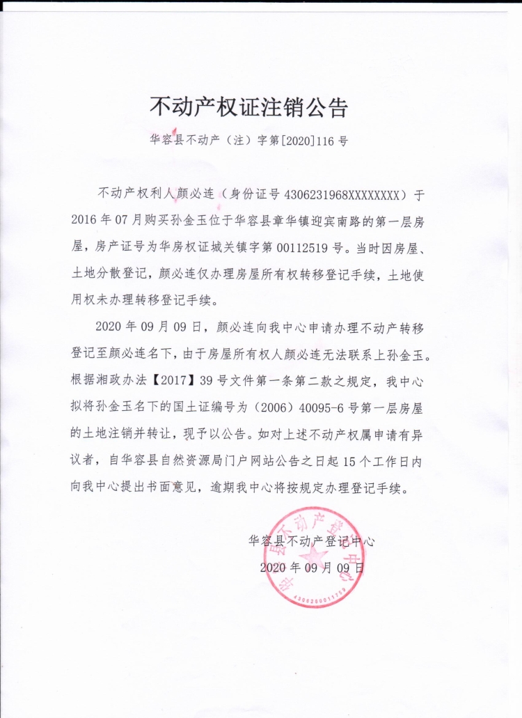 不动产权证书注销公告【(孙金玉转颜必连)】