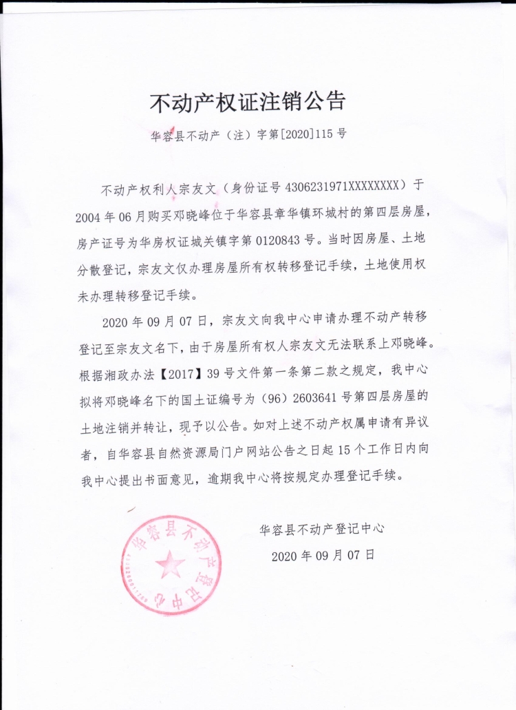不动产权证书注销公告【(邓晓峰转宗友文)】