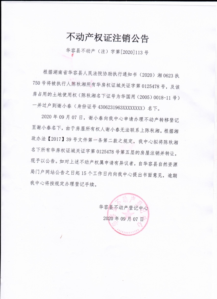 不动产权证书注销公告【(陈秋湘转谢小春)】