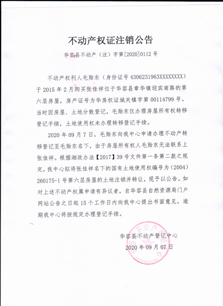 不动产权证书注销公告【(张佳祥转毛贻东)】