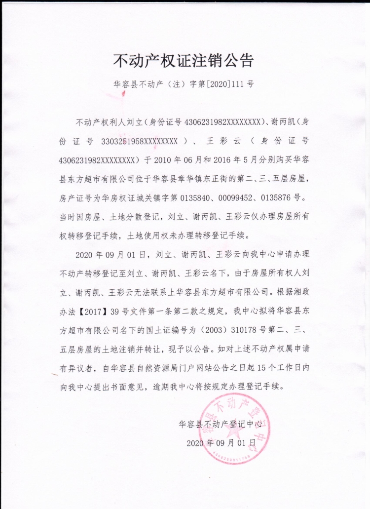 不动产权证书注销公告【(华容县东方超市有限公司转刘立、谢丙凯、王彩云)】