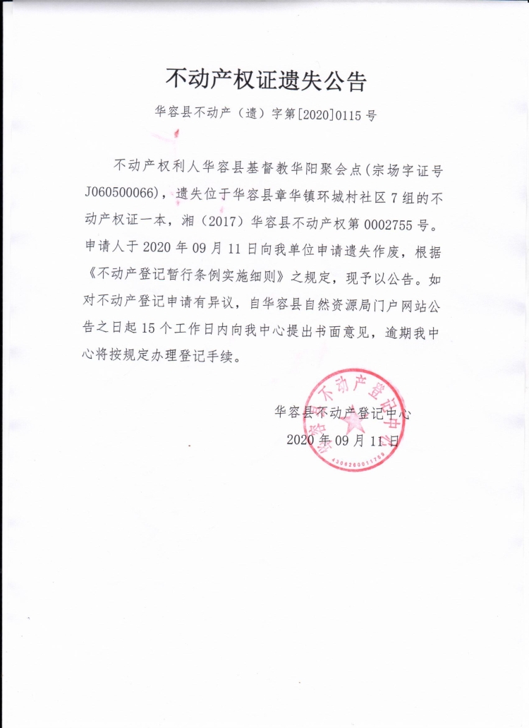 不动产权证遗失公告【不动产权证(华容县基督教华阳聚会点)】
