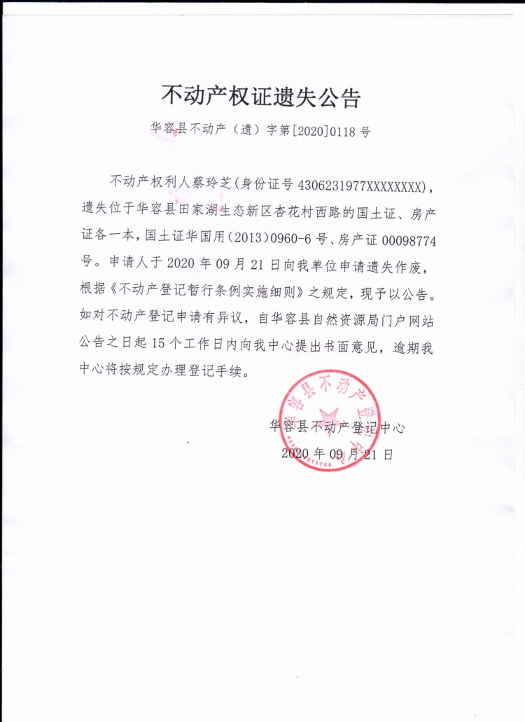 不动产权证遗失公告【国土证 房产证(蔡玲芝)】