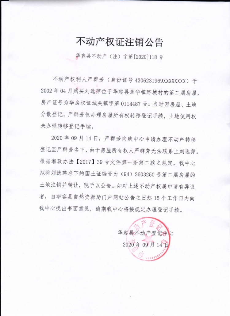 不动产权证书注销公告【(刘选萍转严群芳)】