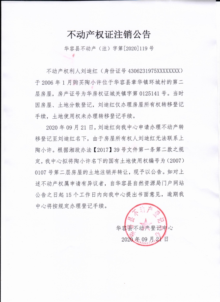 不动产权证书注销公告【(陶小许转刘迪红)】