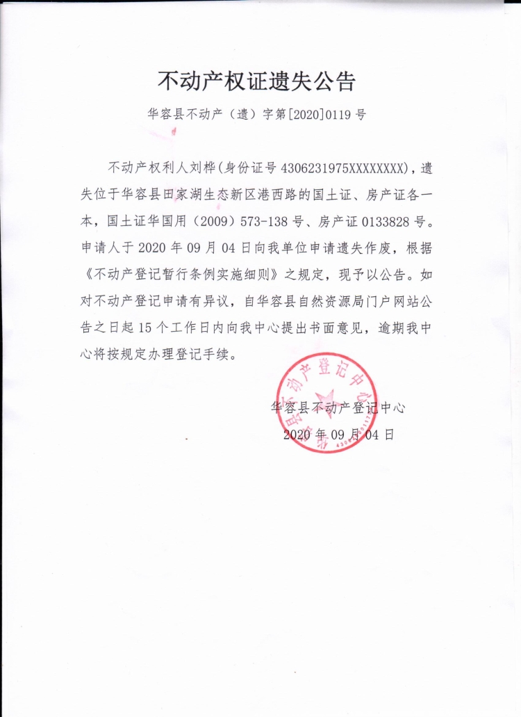 不动产权证遗失公告【国土证 房产证(刘桦)】