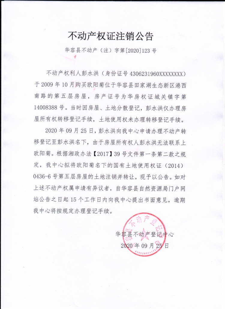 不动产权证书注销公告【(欧阳菊转彭水洪)】