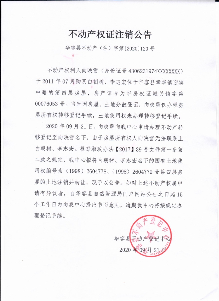 不动产权证书注销公告【(白朝树、李志宏转向映雪)】