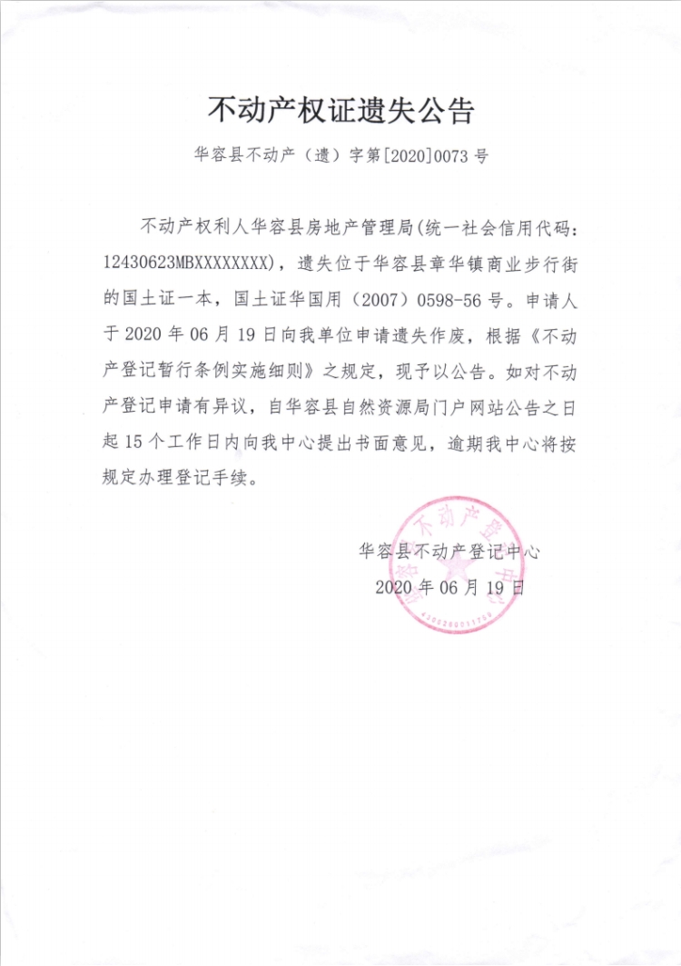 不动产权证遗失公告【国土证(华容县房地产管理局)商业步行街】
