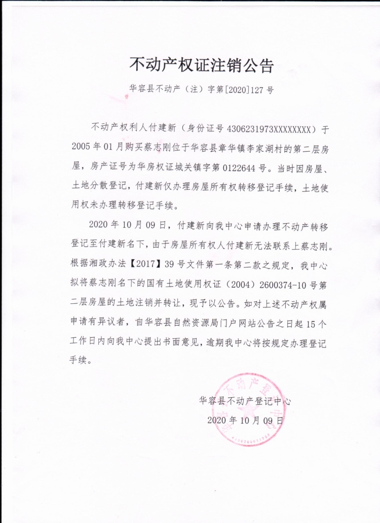 不动产权证书注销公告【(蔡志刚转付建新)】