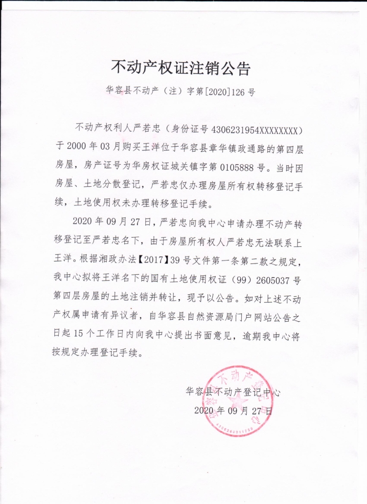 不动产权证书注销公告【(王洋转严若忠)】