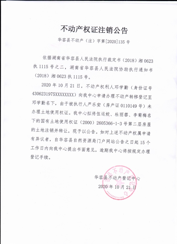 不动产权证书注销公告【(伍运姣、杜丽蓉、李菊梅转邓学勤)】