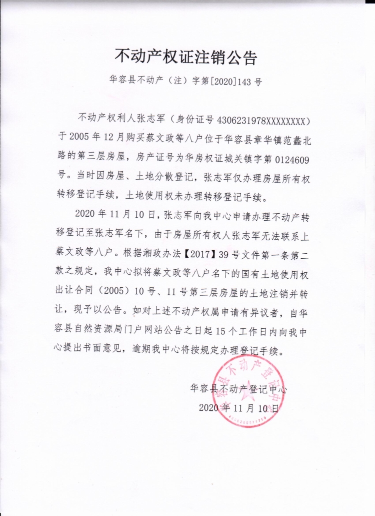 不动产权证书注销公告【(蔡文政等8户转张志军)】
