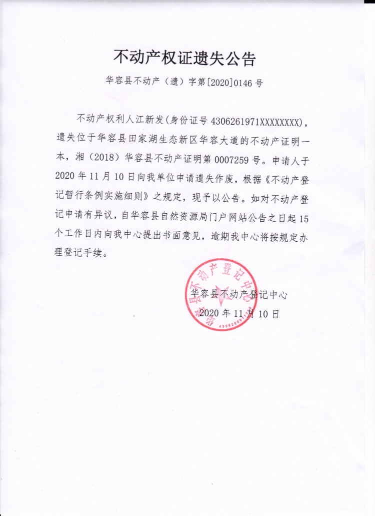 不动产权证遗失公告【不动产权证(江新发)】
