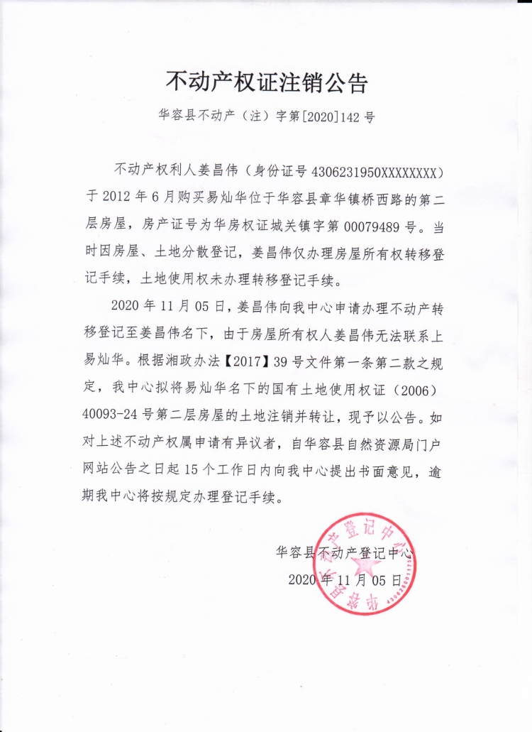 不动产权证注销公告【(易灿华转姜昌伟)】