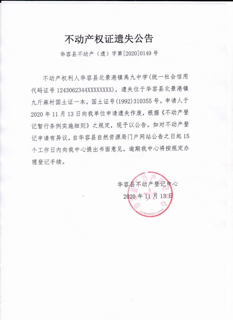 不动产权证遗失公告【国土证(华容县北景港镇禹九中学)】