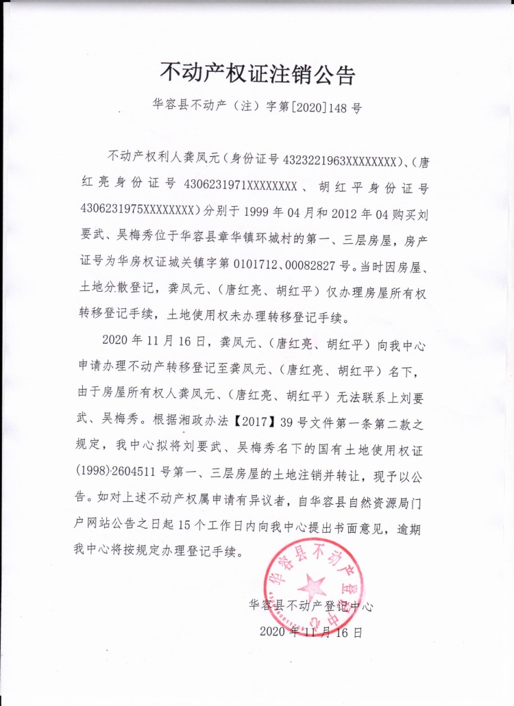 不动产权证书注销公告【(刘要武、吴秀梅转龚凤元、唐红亮、胡红平)】