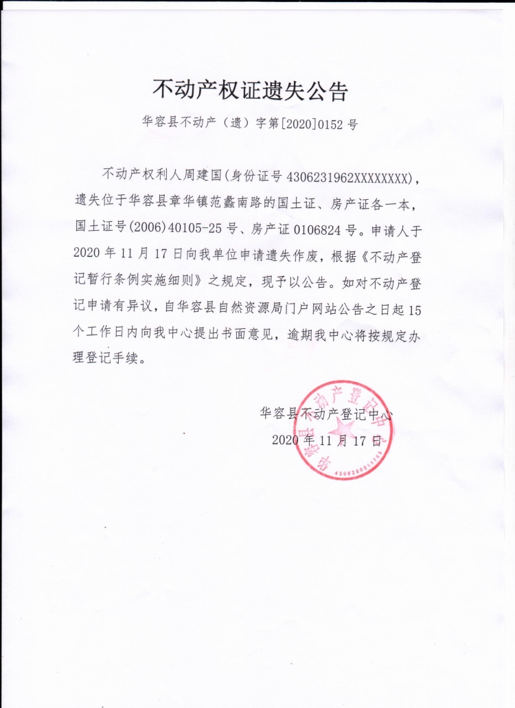 不动产权证遗失公告【国土证 房产证(周建国)】