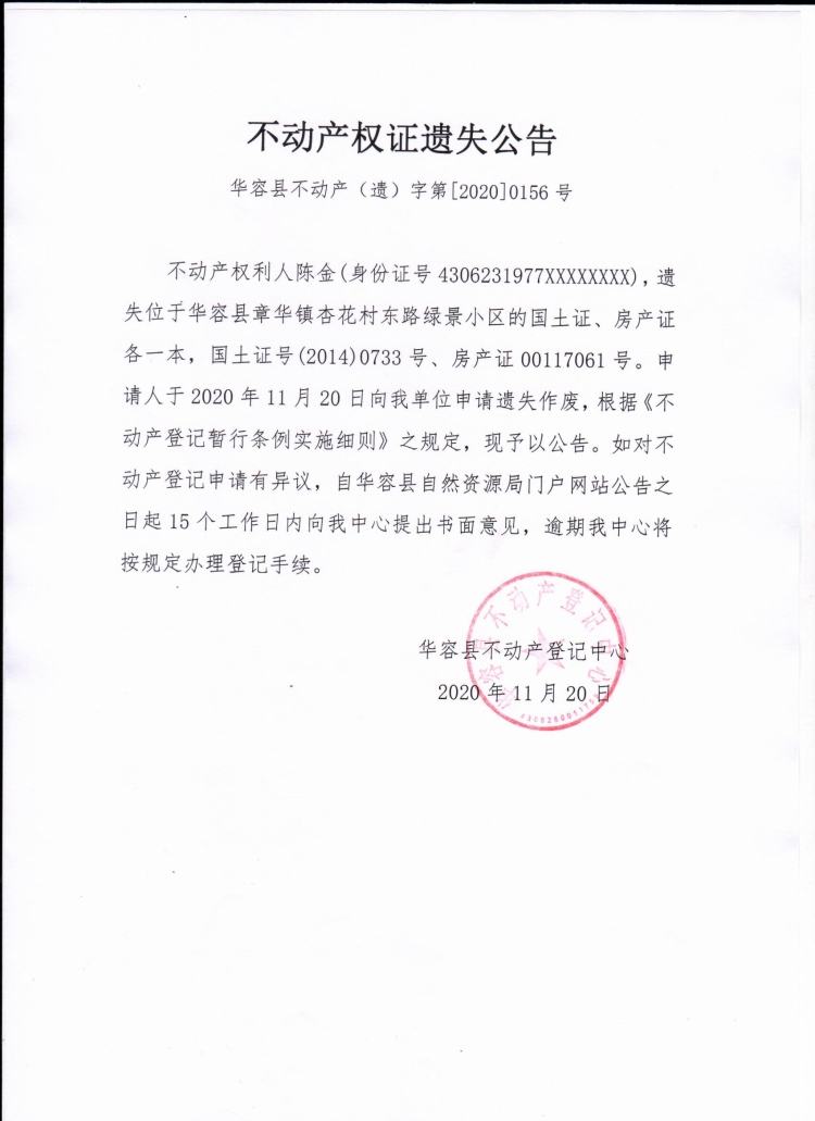 不动产权证遗失公告【国土证 房产证(陈金)】