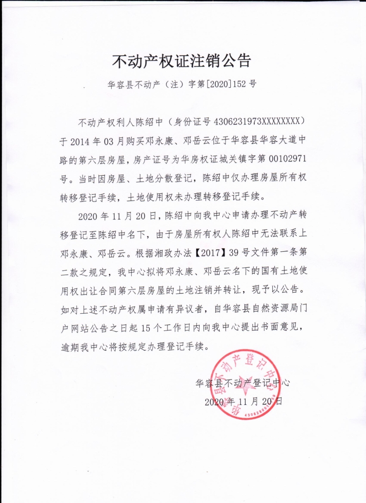不动产权证书注销公告【(邓永康、邓岳云转陈绍中)】