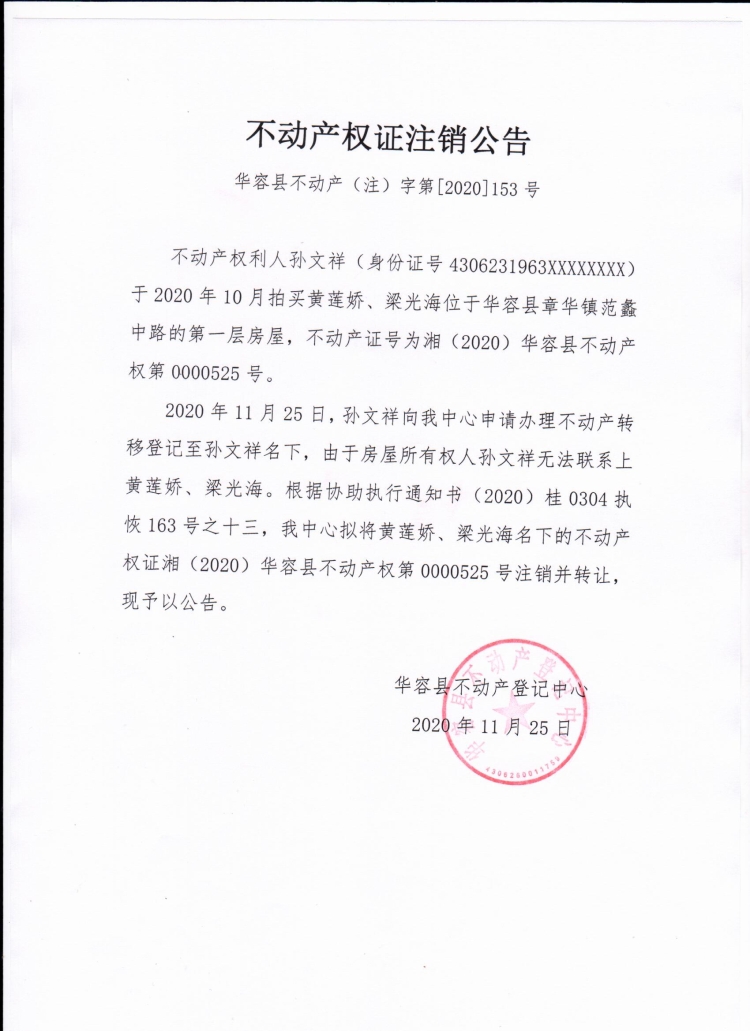 不动产权证书注销公告【(黄莲娇、梁光海转孙文祥)】