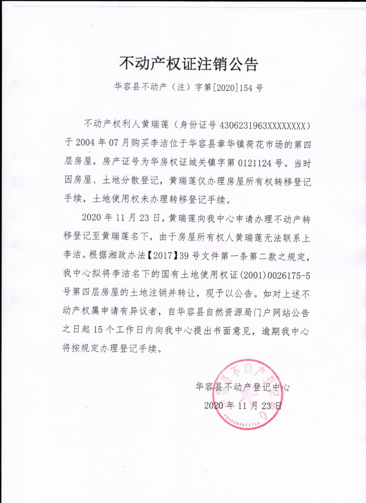 不动产权证书注销公告【(李洁转黄瑞莲)】
