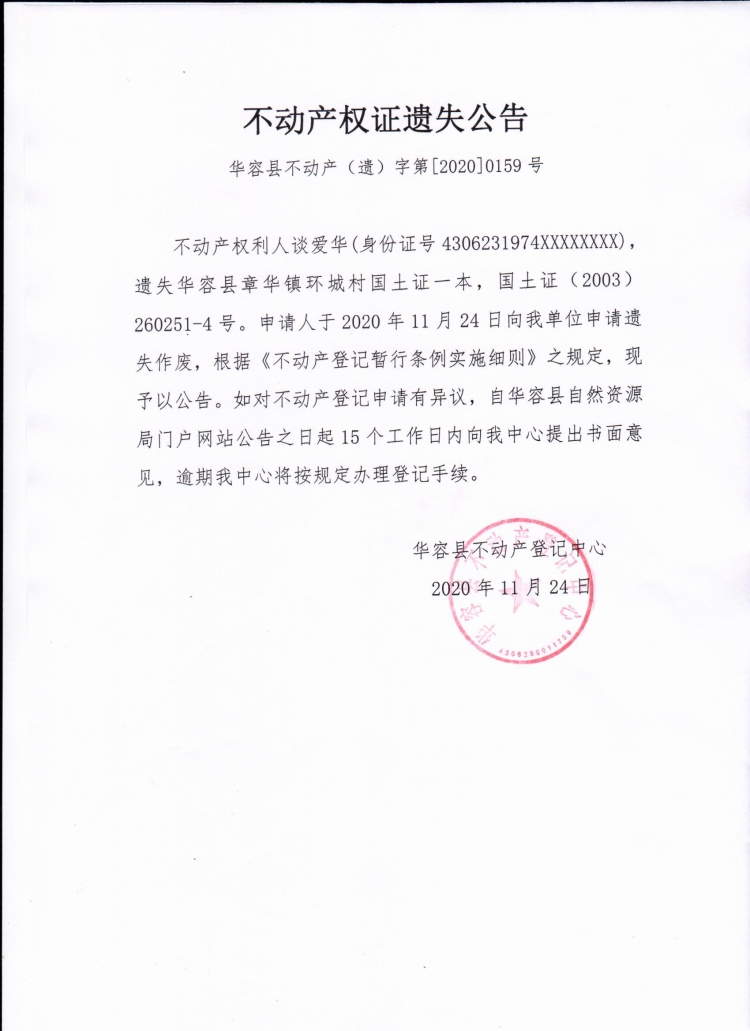 不动产权证遗失公告【国土证(谈爱华)】