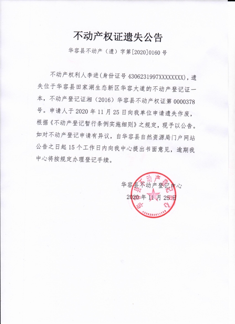 不动产权证遗失公告【不动产权证(李进)】