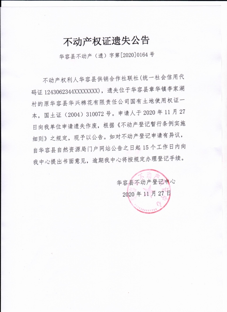 不动产权证遗失公告【国土证(华容县供销合作社联社)】