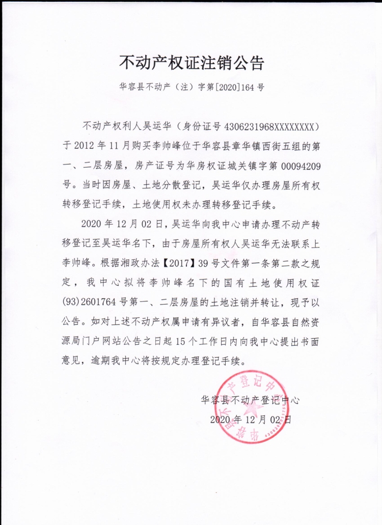 不动产权证书注销公告【(李帅峰转吴运华)】