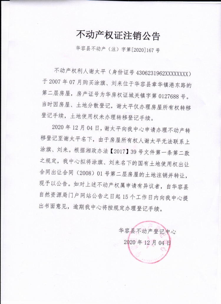 不动产权证书注销公告【(涂旗、刘来转谢太平)】