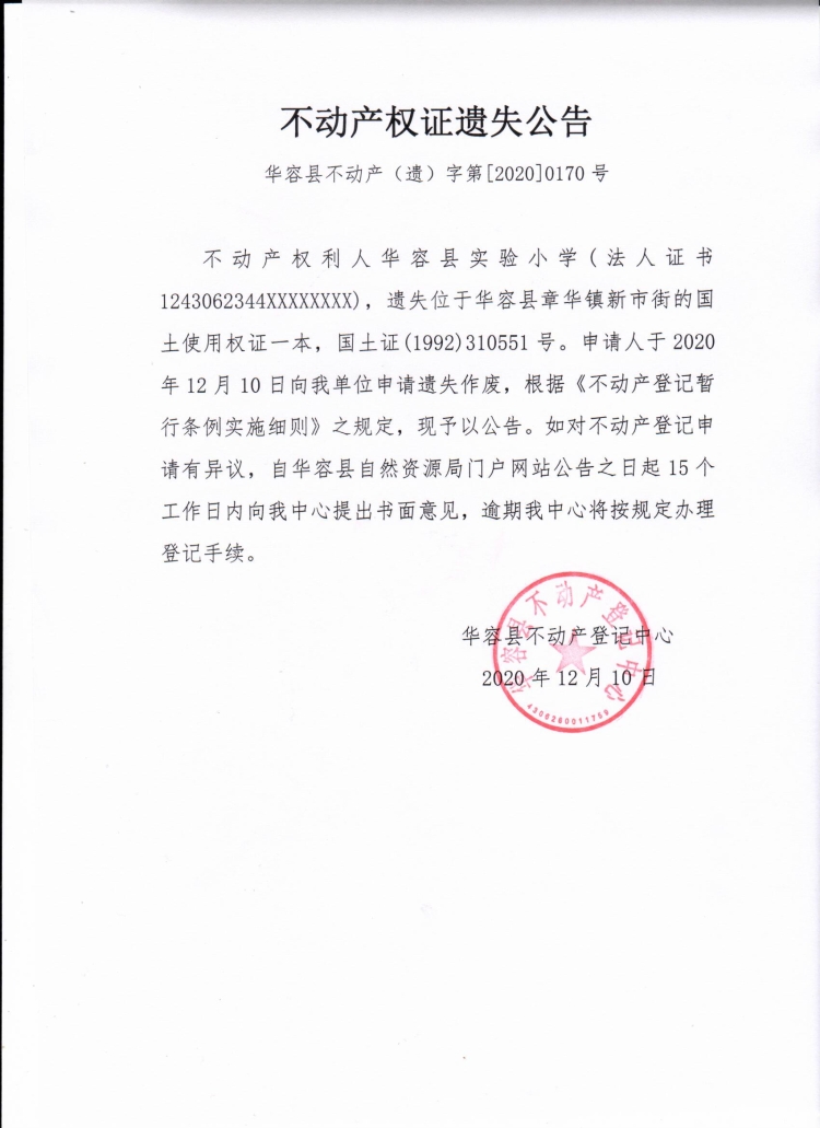 不动产权证遗失公告【国土证(华容县实验小学)】