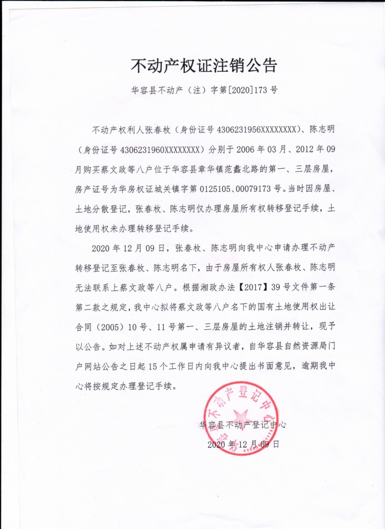 不动产权证书注销公告【(蔡文政等八户转张春枚、陈志明)】