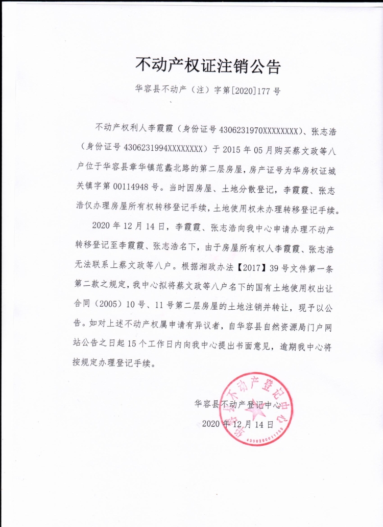 不动产权证书注销公告【(蔡文政等八户转李霞霞、张志浩)】