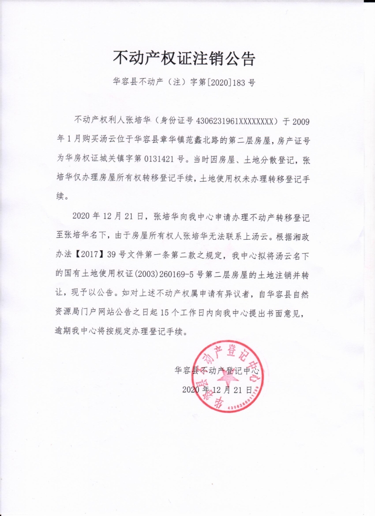 不动产权证书注销公告【(汤云转张培华)】