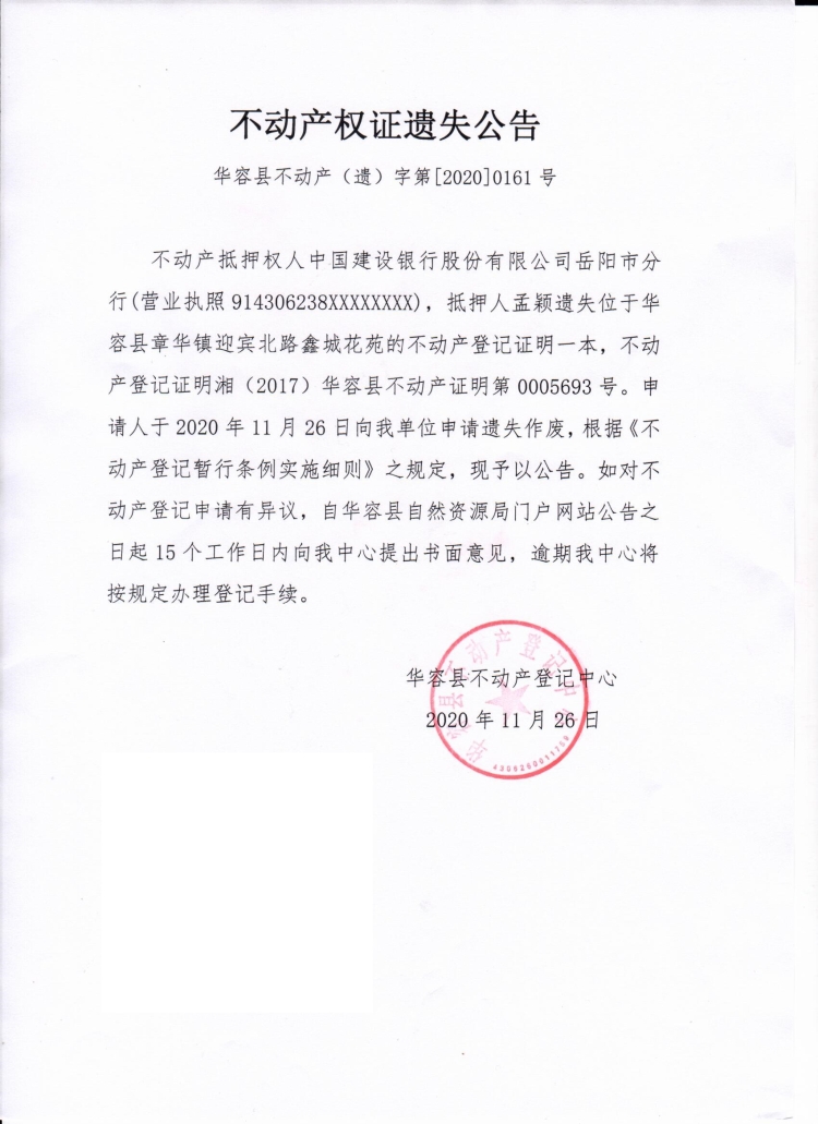 不动产权证遗失公告【不动产权证(中国建设银行股份有限公司岳阳市分行)】