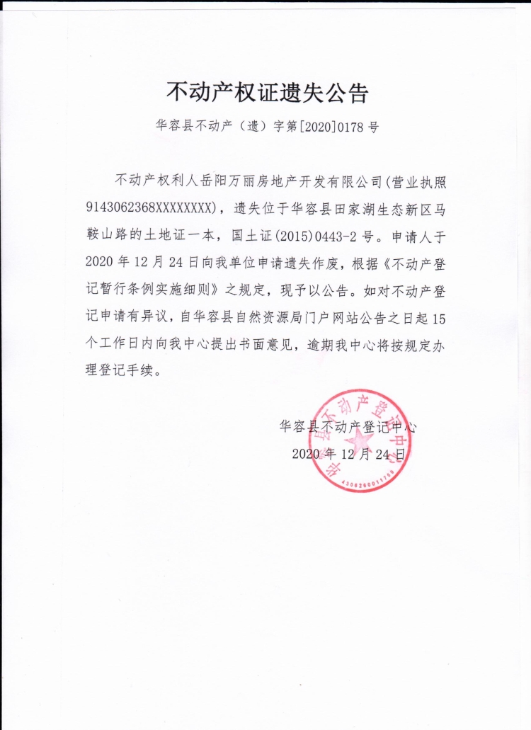 不动产权证遗失公告【国土证(岳阳万丽房地产开发有限公司)】