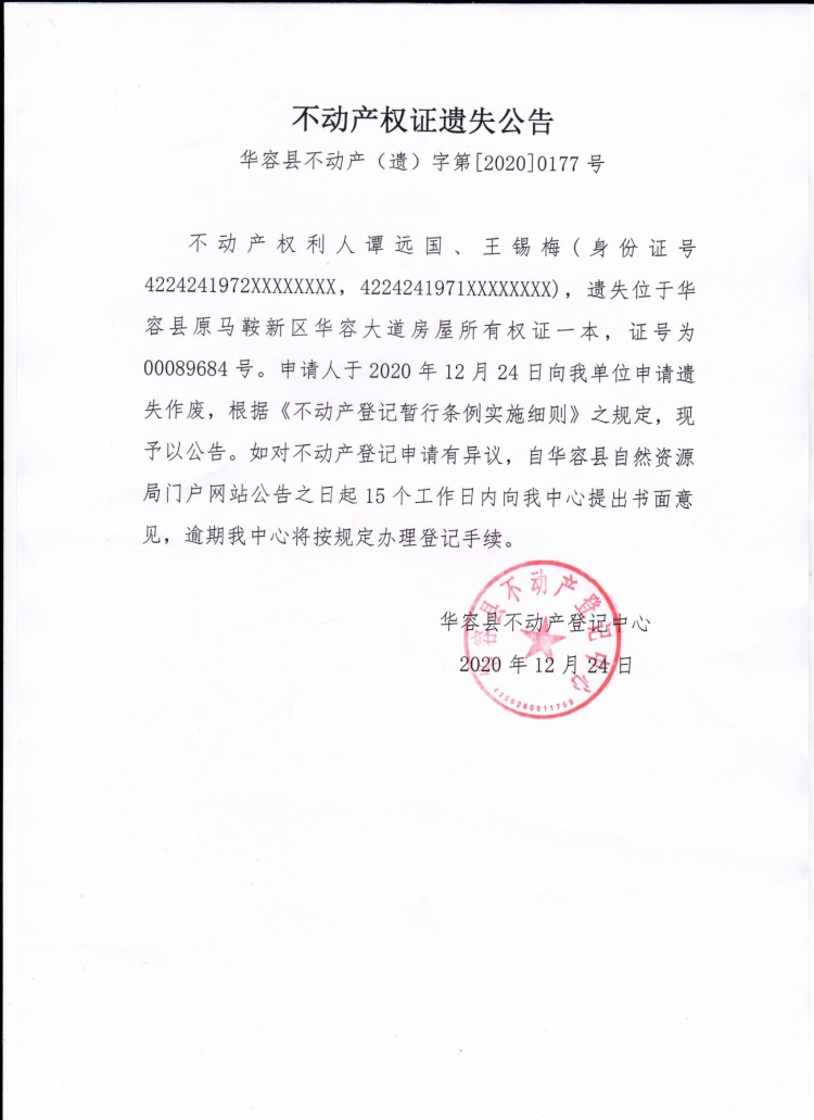 不动产权证遗失公告【房产证(谭远国、王锡梅)】