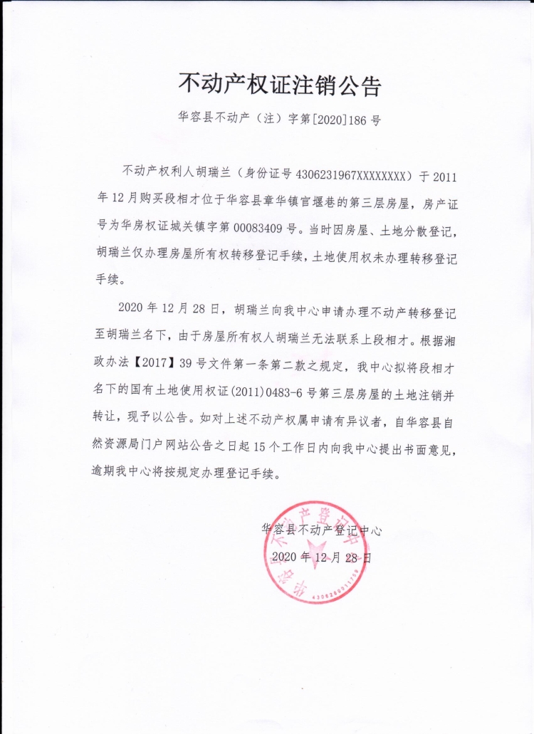 不动产权证书注销公告【(段相才转胡瑞兰)】