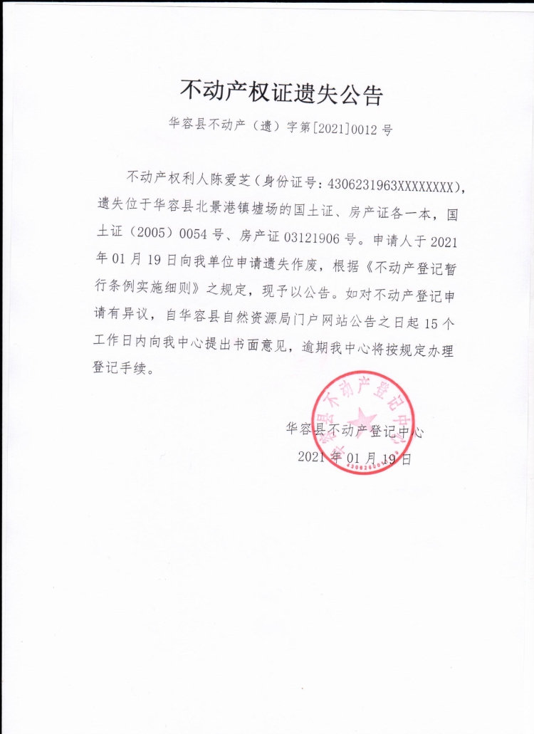 不动产权证遗失公告【国土证 房产证(陈爱芝)】