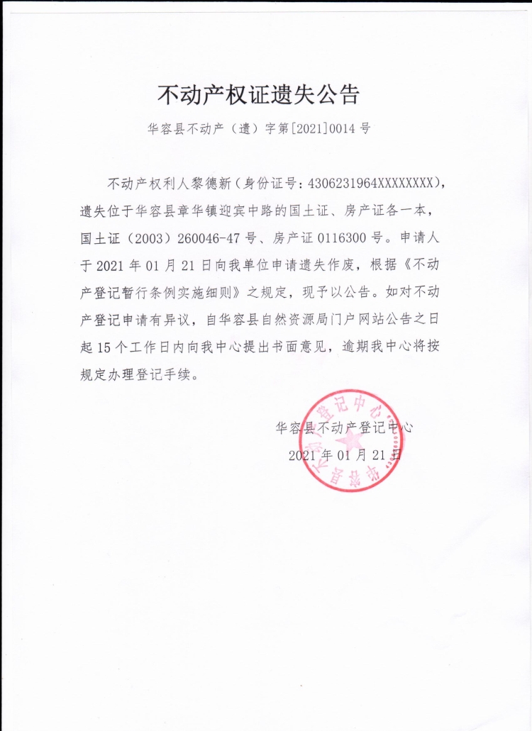 不动产权证遗失公告【国土证 房产证(黎德新)】