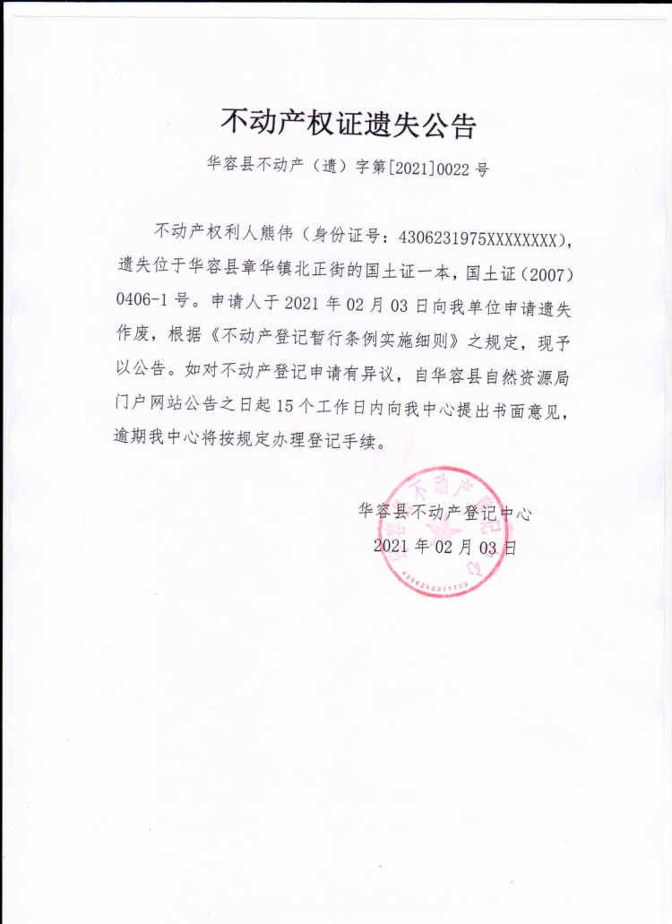 不动产权证遗失公告【国土证(熊伟)】