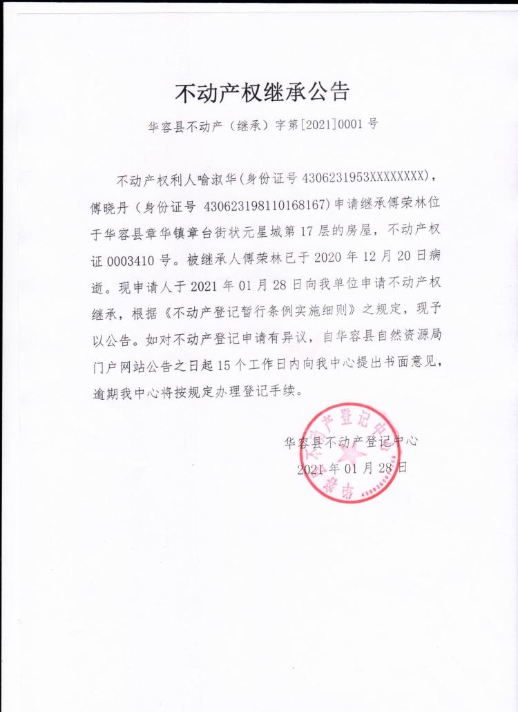 不动产权继承公告【(傅荣林转喻淑华、傅晓丹)】