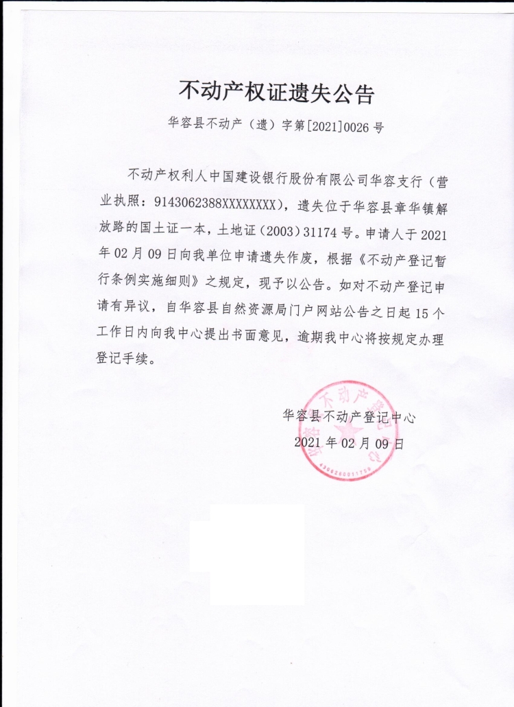 不动产权证遗失公告【国土证(中国建设银行服份有限公司华容支行)】