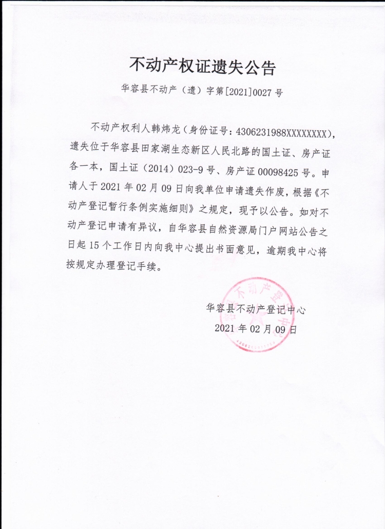 不动产权证遗失公告【国土证 房产证(韩炜龙)】