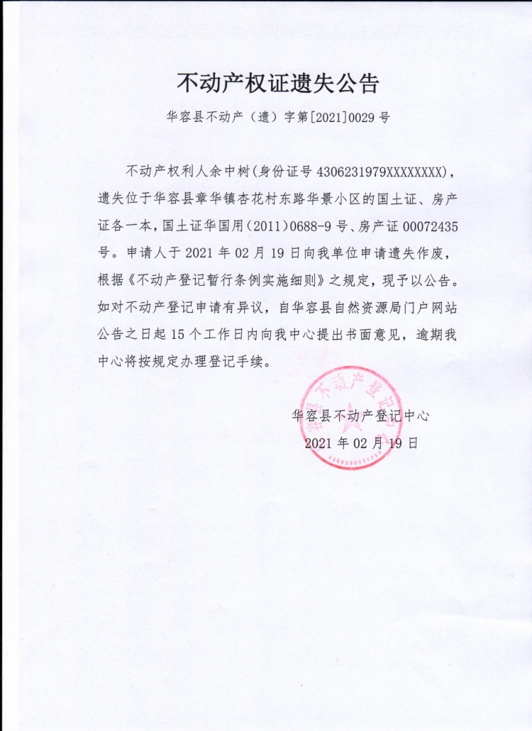 不动产权证遗失公告【国土证 房产证(余中树)】