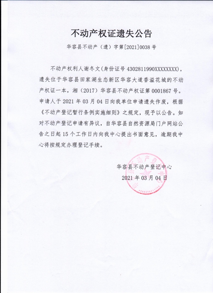 不动产权证遗失公告【不动产权证(谢冬文)】
