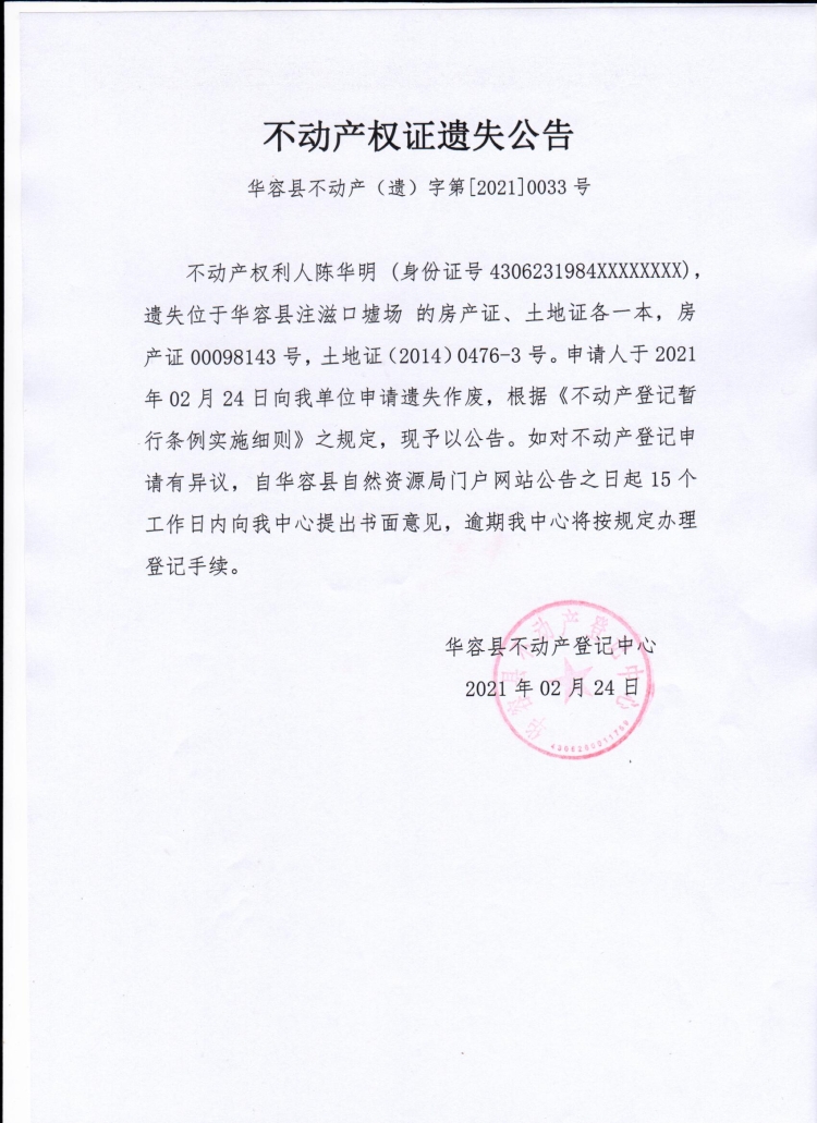 不动产权证遗失公告【国土证 房产证(陈华明)】