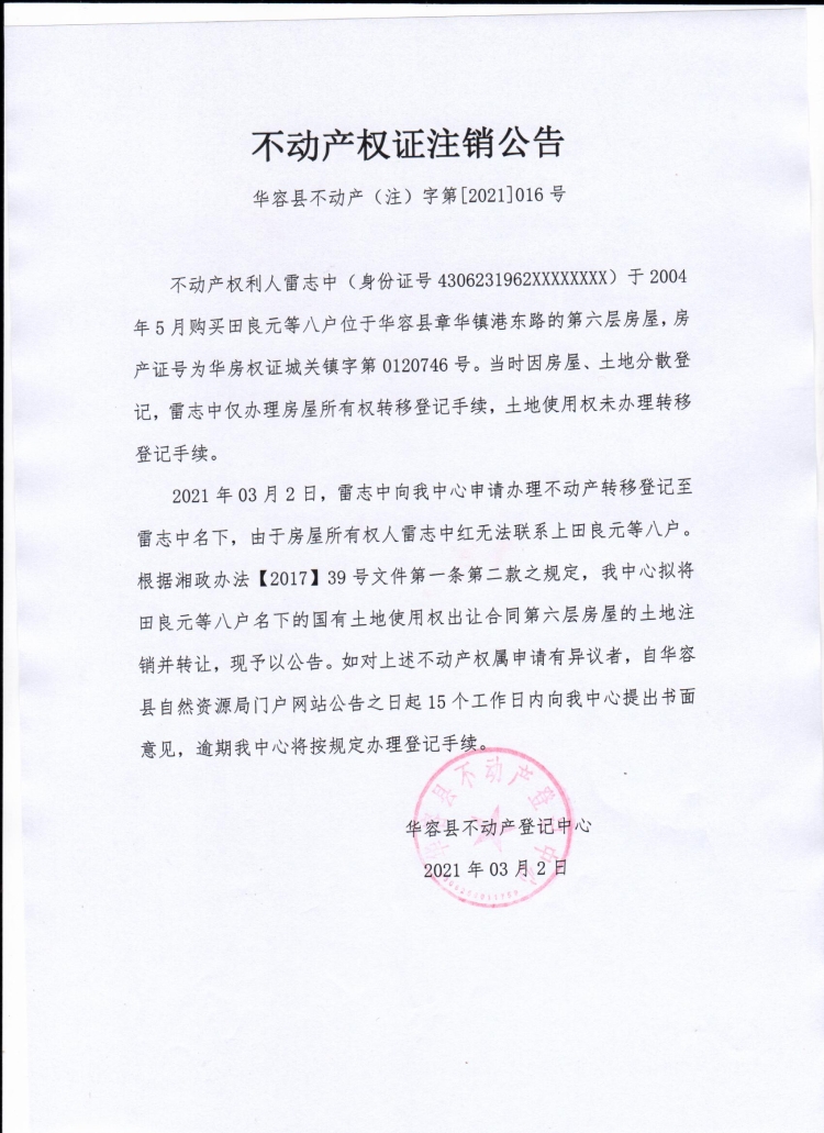 不动产权证书注销公告【(田良元等八户转雷志中)】
